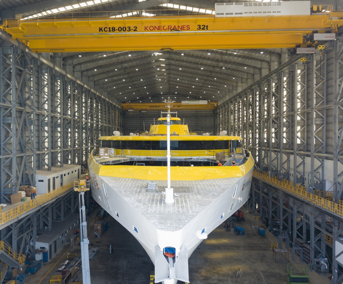In addition to the installation of the four Kongsberg KaMeWa 125 S3 waterjets, Austal Philippines also completed the installation of the major Austal MOTION CONTROL SYSTEM components, including swinging T-foils, trim flaps as well as the streamlined, drop-down bow thrusters at the same time; effectively all of the highly efficient underwater appendages to the trimaran hull form that help deliver superior seakeeping and passenger comfort.