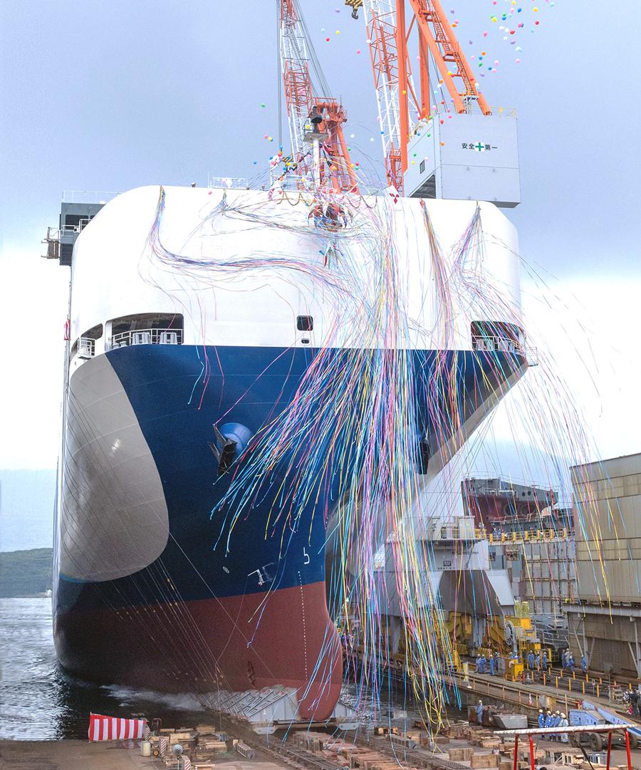 Mitsubishi Shipbuilding Co., Ltd., a Mitsubishi Heavy Industries (MHI) Group company, today held a christening and launch ceremony for the TRANS HARMONY EMERALD, the second of two LNG-powered roll-on/roll-off (RO/RO) ships(Note) under construction for Toyofuji Shipping Co., Ltd. The ceremony took place at the Enoura Plant of MHI's Shimonoseki Shipyard & Machinery Works in Yamaguchi Prefecture. The ship's handover is scheduled for June 2025 following completion of outfitting work and sea trials. The TRANS HARMONY EMERALD will serve as a RO/RO vessel on shipping routes in Asia.