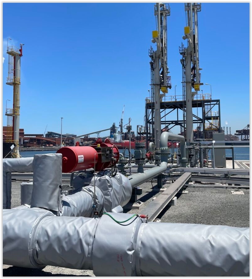 Commissioning of the onshore receiving facility is now underway, which ensures the functionality of all equipment at the import terminal including the control system, marine loading arms and fire system.